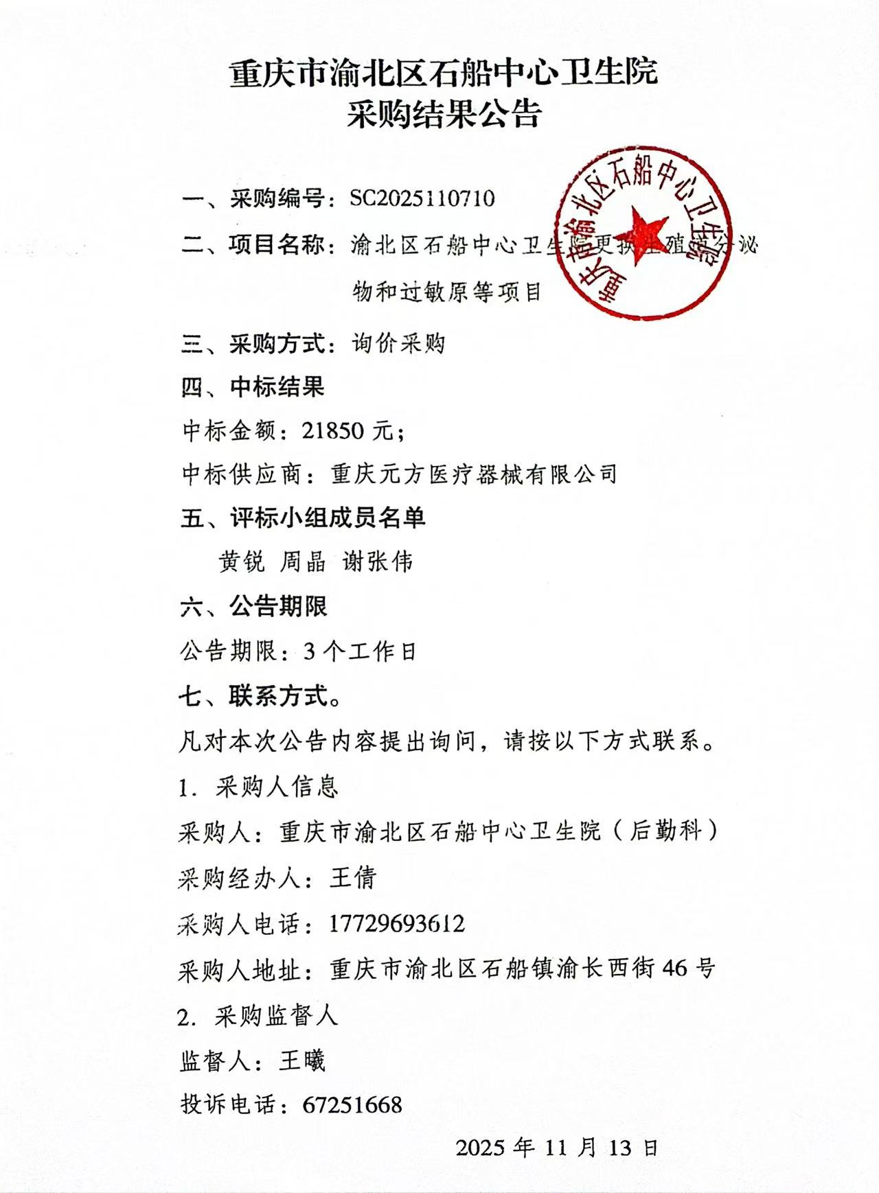 ******卫生院更换生殖道分泌物和过敏原等项目结果公告