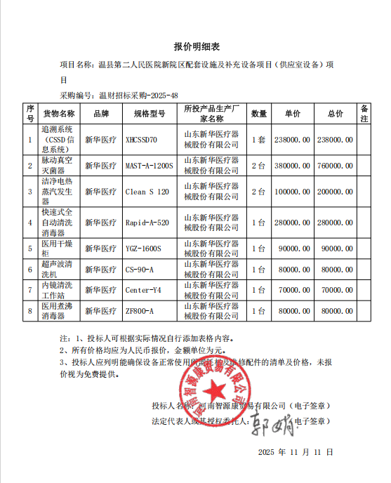 | 1、采购供应室设备,采购追溯系统1套、脉动真空灭菌器2台、洁净电热蒸汽发生器2台等(详见招标文件)。 2、质保期:整机质保1年。 3、合同履行期限:合同签订后30日历天。 | |||||||||||||||||||||||||||||||