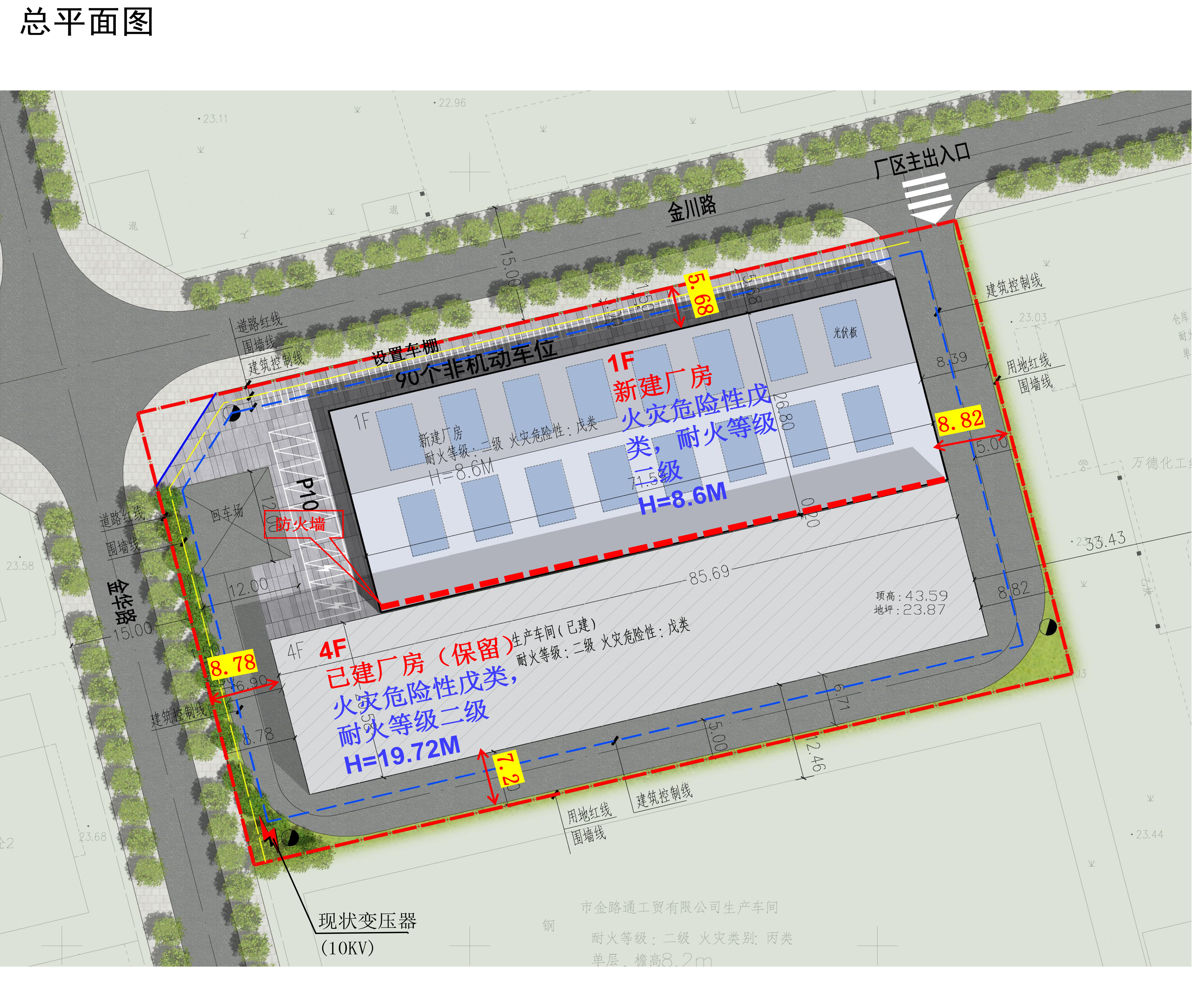 规划设计拟在地块内现状厂房北侧新建1栋1层戊类厂房(中间设置防火墙),总建筑面积约8735.73㎡,计容建筑面积约10654.33㎡,新增建筑面积约1918.6㎡,新增计容建筑面积约3837.2㎡。厂区容积率约1.79,建筑系数约61.8%,绿地率约2.6%。规划设置机动车停车位约10个,非机动车停车位约90个。