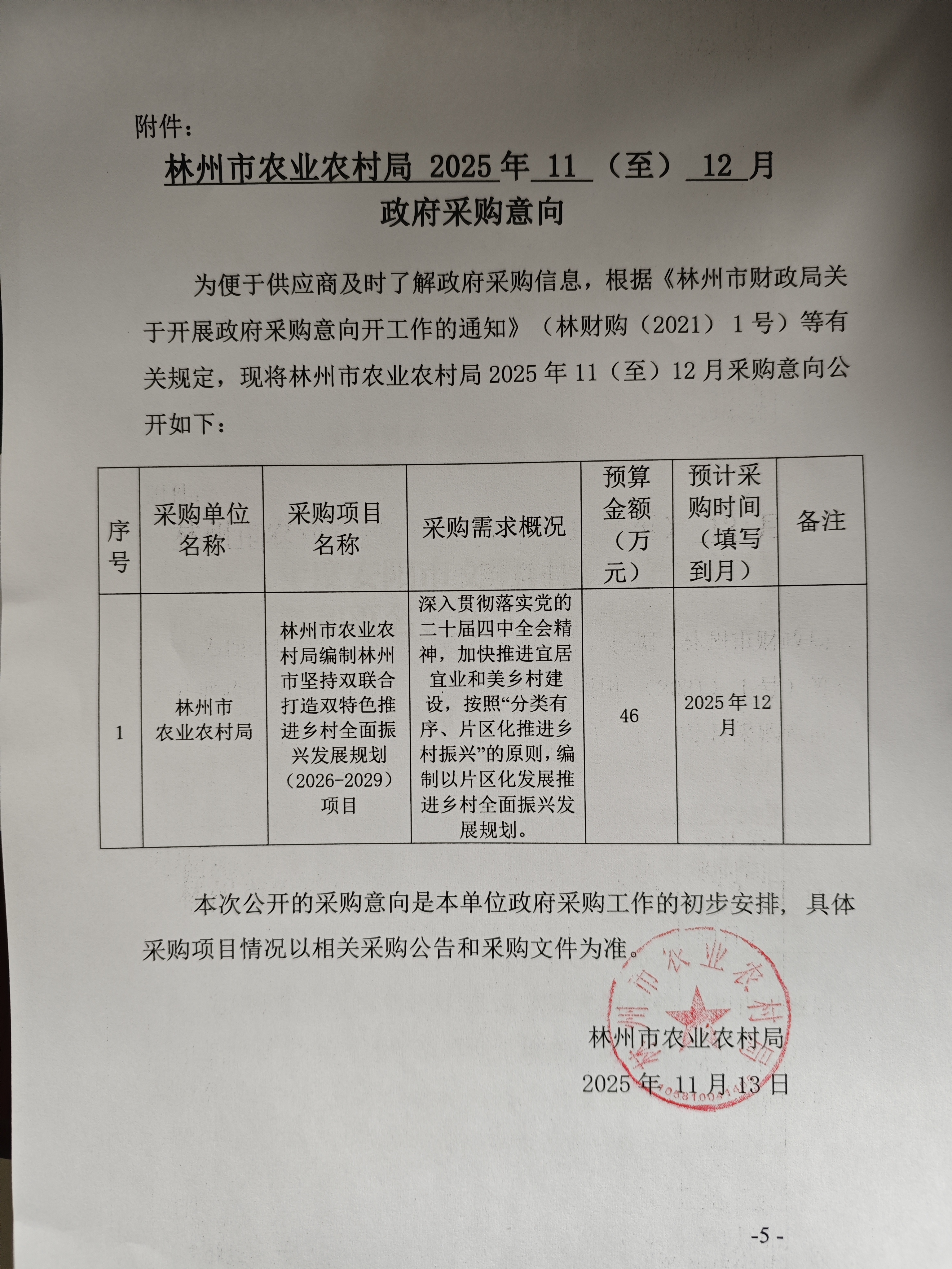 为便于供应商及时了解政府采购信息,根据《河南******农村局 2025年11(至)12月采购意向公开如下: