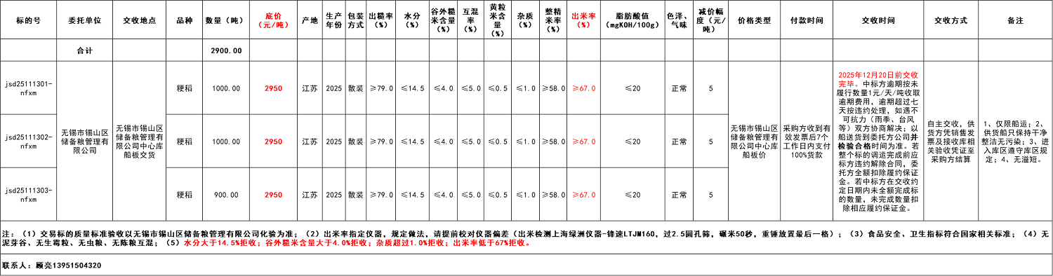 4.交收事项:******有限公司化验为准;(2)出米率指定仪器,规定做法,请提前校对仪器偏差(出米检测上海绿洲仪器-锋速LTJM160,过2.5圆孔筛,碾米50秒,重锤放置最后一格);(3)食品安全、卫生指标符合国家相关标准;(4)无泥芽谷、无生霉粒、无虫粮、无陈粮互混;(5)水分大于14.5%拒收;谷外糙米含量大于4.0%拒收;杂质超过1.0%拒收;出米率低于67%拒收。(6)仅限船运;供货船只保持干净整洁无污染;进入库区遵守库区规定;无溢短。