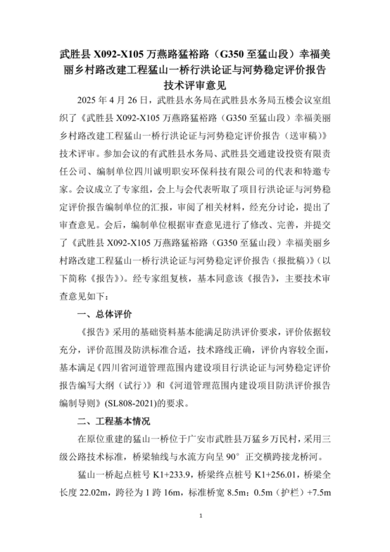 附件:1.《武胜县X092-X105万燕路猛裕路(G350至猛山段)幸福美丽乡村路改建工程猛山一桥行洪论证与河势稳定评价报告行洪论证与河势稳定评价报告》技术审查意见