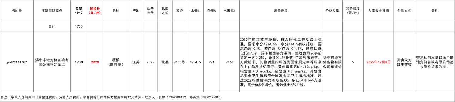 2.品质要求:2025年度江苏产粳稻,符合国标二等及以上标准,要求水分≤14.5%;水分>14.5有权拒收;要求杂质≤1%,若杂质1%<杂质≤1.5%,过筛回杂(过筛入库,筛下物由卖方带回,整理费用以事前商定一致为准),杂质>1.5%拒收;色泽气味正常,无黄粒米,其他质量指标达到国家规定中等标准以上;品质指标宜存,黄曲霉毒素B1<10ug/kg,铅含量<0.2mg/kg,镉含量<0.2mg/kg,其他食品安全卫生指标符合国家食品卫生指标标准,超过规定标准的买方有权拒收。以出米率66%为基准,高于66%不增价,出米低于66%拒收。净粮入仓前费用(含整理费用、劳务人员费用、平仓费等)由中标方按照每吨12元结算。