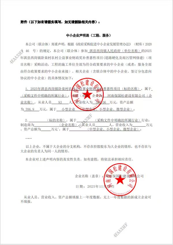 | ******人民政府2025年淇县西岗镇卧栾村农村公益事业财政奖补普惠性项目(道路硬化及雨污管网修建)项目 | |||||||||||||||||||||||||||||||