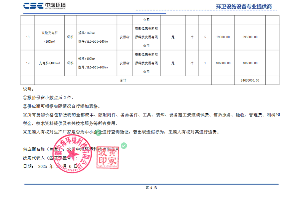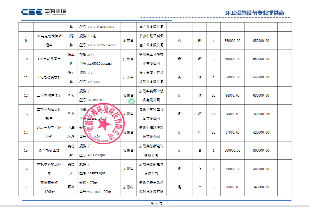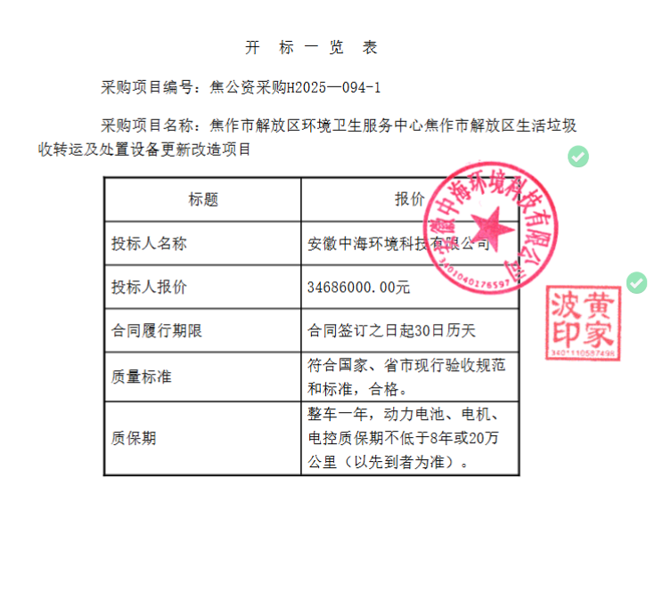 | 1.采购需求:本项目为焦作市解放区生活垃圾收转运及处置设备更新改造项目(一期),主要采购:新能源自卸式垃圾车13辆、12吨新能源洗扫车7辆、18吨新能源洗扫车3辆、12吨新能源吸尘车2辆、18吨新能源洒水车2辆、18吨新能源雾炮车2辆、5吨新能源装载机1辆、12吨新能源吸污车1辆、4吨新能源除雪车2辆、拉站钩臂转运车1辆、三轮电动垃圾运输车100辆、三轮电动冲洗车20辆、垃圾分类专用垃圾箱25个以及相匹配的2台变压器(环卫停车场、党校南垃圾中转场)、充电桩等配套设施; 2.合同履行期限:整车一年,动力电池、电机、电控质保期不低于8年或20万公里(以先到者为准)。 | |||||||||||||||||||||||||||||||