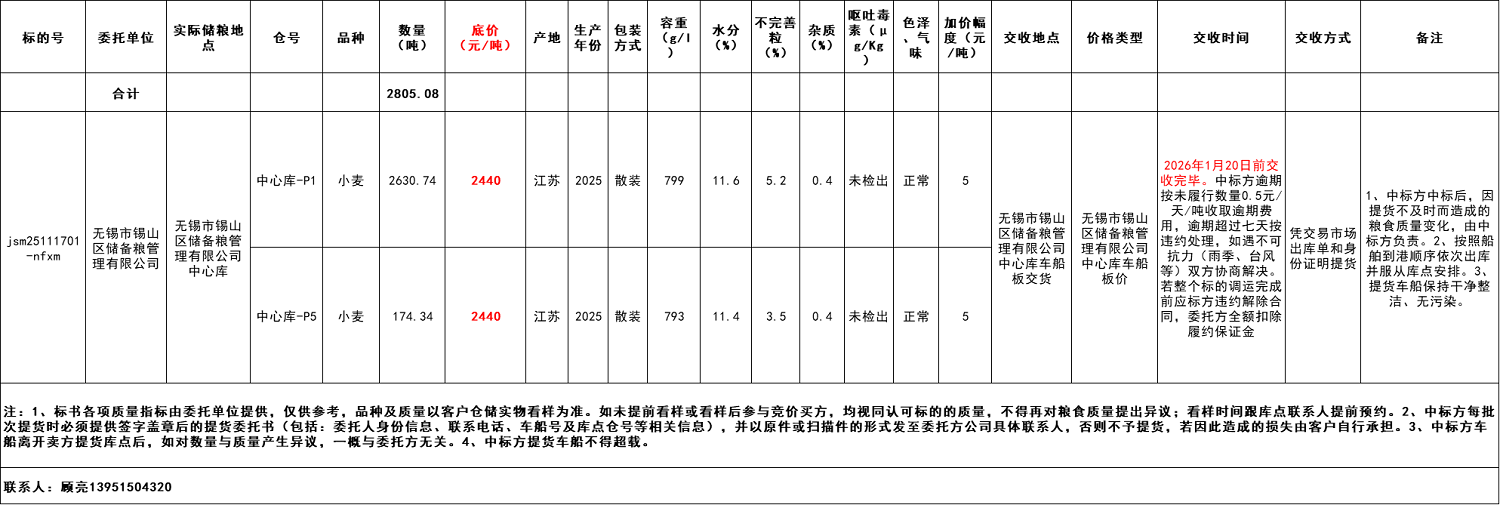交易价格:******有限公司中心库车船板价。应价起点数量为每个标的的全部数量。销售底价:2025年产小麦2440元/吨,竞价阶梯5元/吨,收取中标方成交金额2‰的手续费。
