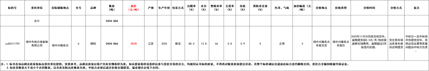 质量:公告中提供的质量指标由委托单位提供,仅供参考。竞购方须到库点看样(看样时间需提前预约,联系人:张经理******;苏经理******313),以确保对质量及保管状况有充分了解。如竞购方未进行看样,则在成交后应自觉履行各项义务,且不得以质量问题为由提出异议或申请商务处理。