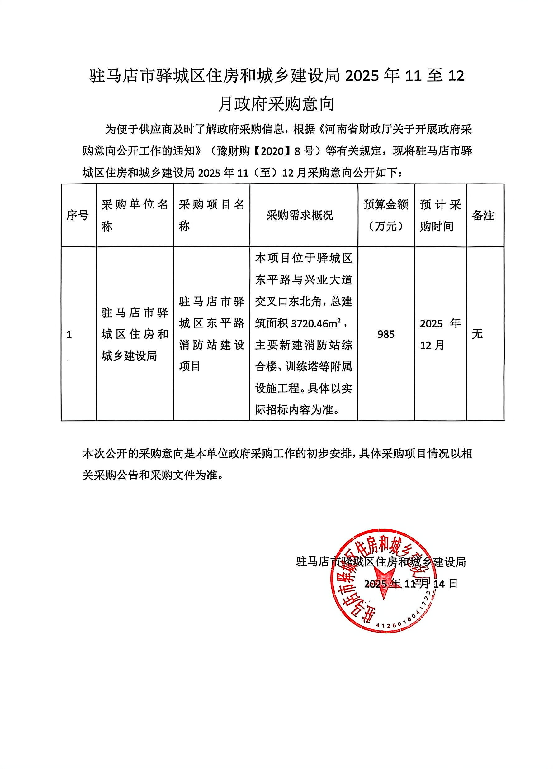 为便于供应商及时了解政府采购信息,根据《河南省财政厅关于开******建设局 2025年11(至)12月采购意向公开如下: