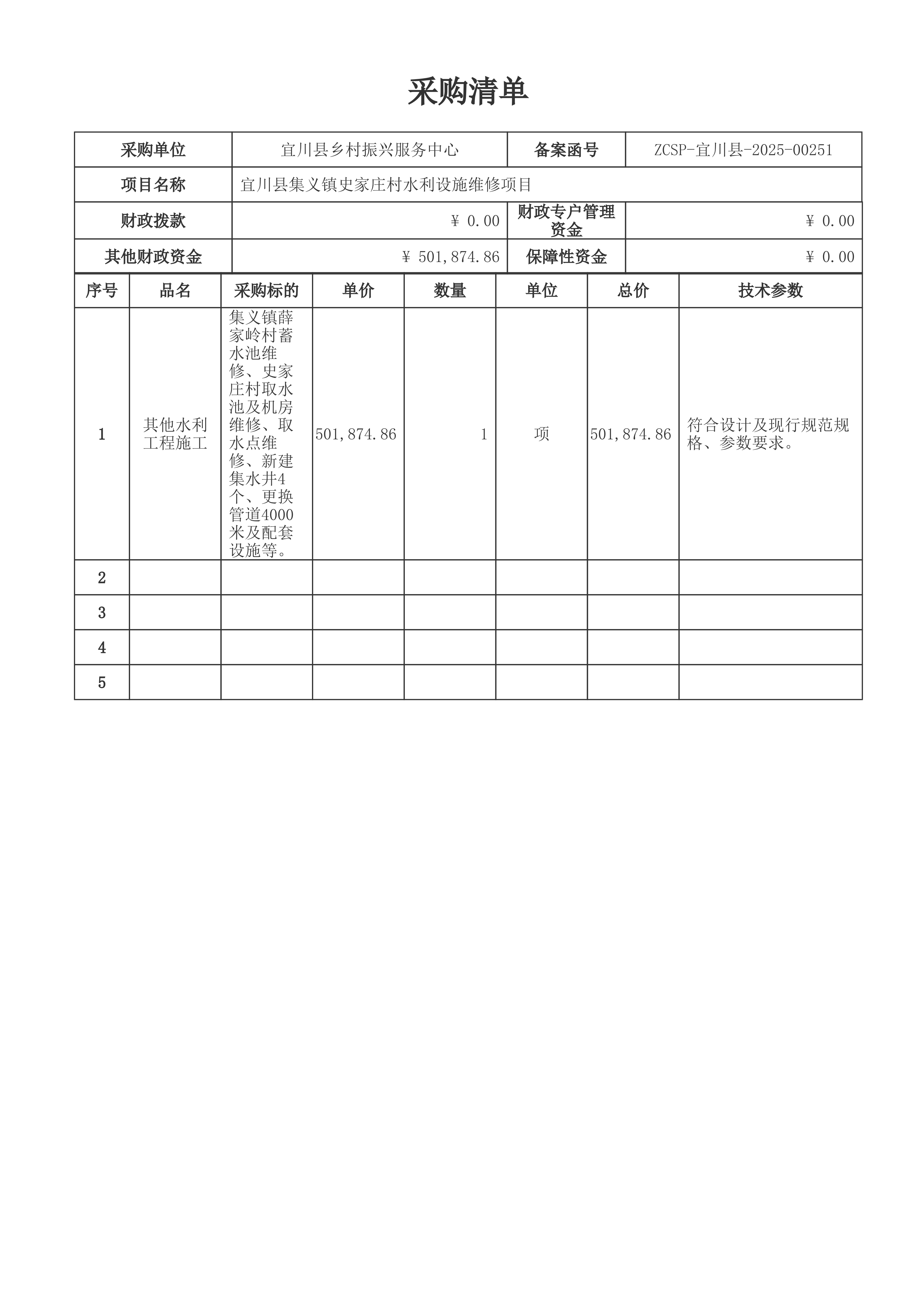 | 1-1 | 其他水利工程施工 | 集义镇薛家岭村蓄水池维修、史家庄村取水池及机房维修、取水点维修、新建集水井4个、更换管道4000米及配套设施等。 | 1(项) | 详见采购文件 | 501,874.86 |