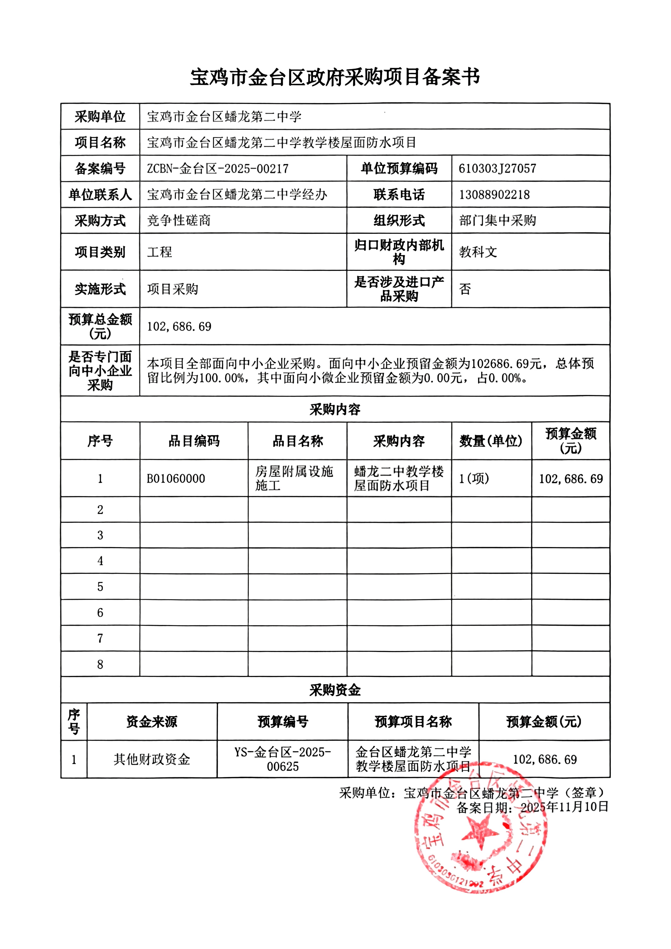 | 1-1 | 房屋附属设施施工 | 蟠龙二中教学楼屋面防水项目 | 1(项) | 详见采购文件 | 102,686.69 |