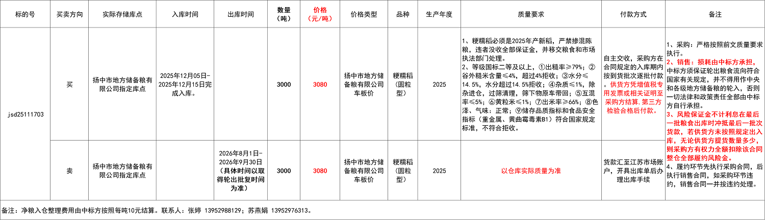 2025年产粳糯稻(圆粒型)3000吨,共1个标段。(详见交易清单)