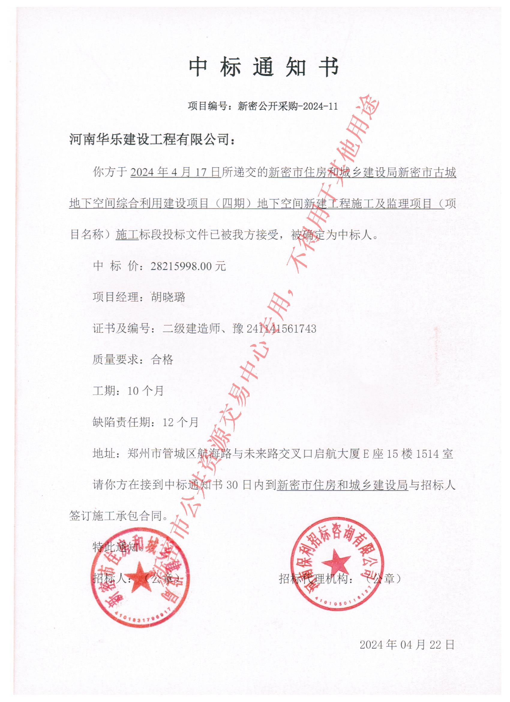 | 项目名称: | ******建设局新密市古城地下空间综合利用建设项目(四期)地下空间新建工程施工及监理项目 | 项目编号: | 新密公开采购-2024-11 |